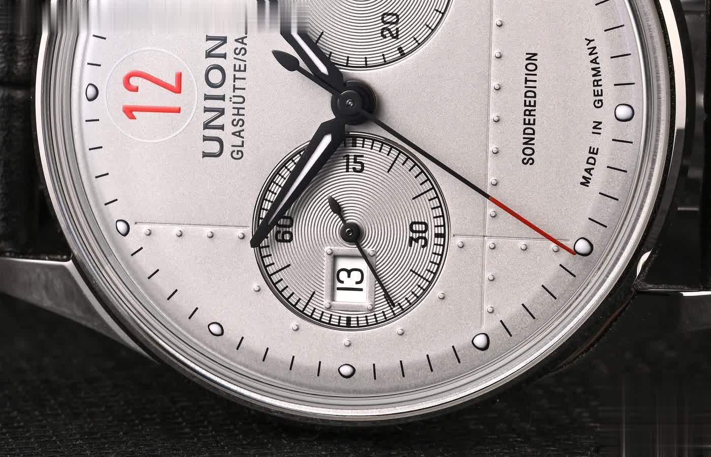 在表镜上采用了无前圈拱形蓝宝石玻璃表镜,能够使表镜视野更开阔,也是经典的复古设计。表盘设置了两个小表盘,3时位置为30分钟计时盘,9时位置为小秒盘,并将日历窗巧妙的放置在小秒盘中。30分钟计时盘上时针,以及中央计时秒针的顶端,都涂上了红色的漆料。不仅能够与12点位形成呼应,能够在看时是更加醒目,并且作为盘面的点睛之笔相当亮眼。