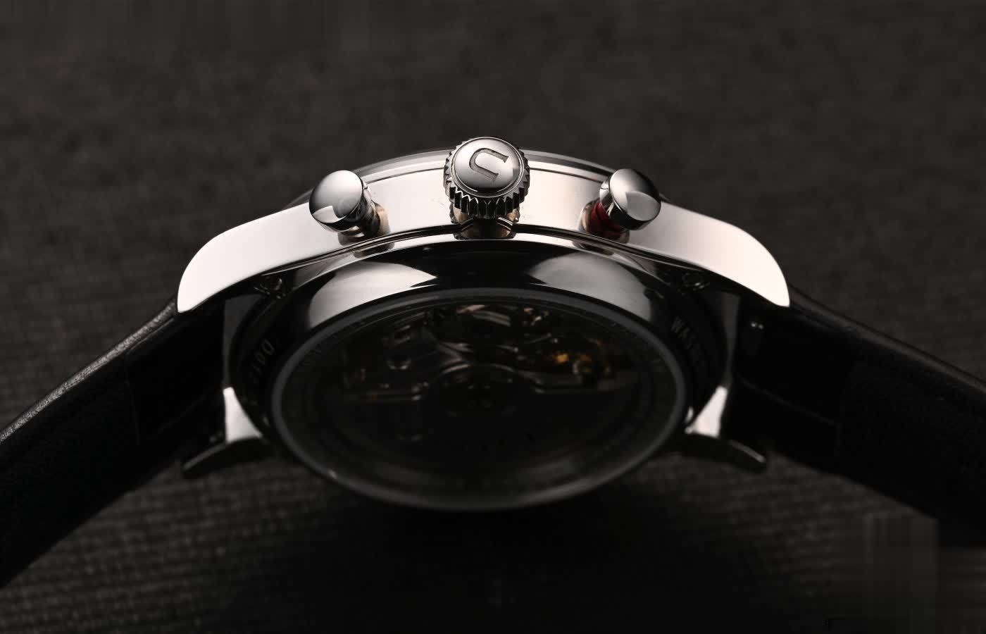 这枚腕表采用精钢材质打造,表侧采用拉丝打磨工艺。搭配上50-60年代经典的蘑菇表冠,进一步凸显了这枚腕表的复古设计。计时按钮采用了泵式按钮的设计,相当复古。这枚腕表在计时启动/停止的按钮处采用红色阳极氧化铝处理。