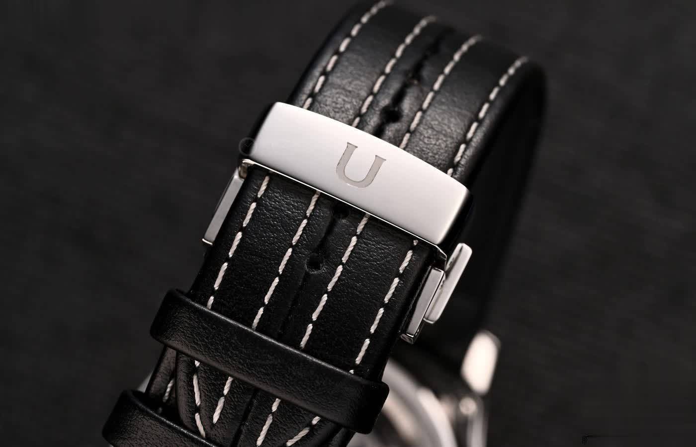 腕表搭配了一条黑色小牛皮白色缝线表带,在表扣处刻有宇联标志的“U”标志。表扣经过打磨后相当光滑。